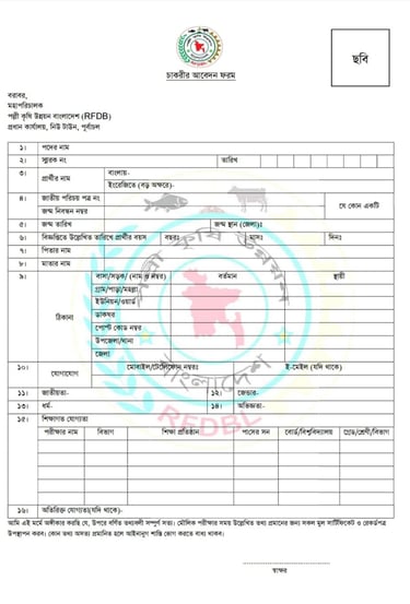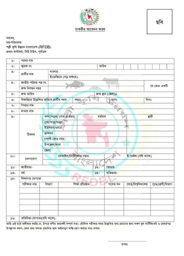 পল্লী কৃষি উন্নয়ন বাংলাদেশ ( RFDBL) এই প্রতিষ্ঠানের আবেদন করতে উক্ত ফর্মটিকে ব্যবহার করতে হবে। প্রয়োজনীয় পদক্ষেপ নেওয়ার জন্য তথ্য সরবরাহ করতে হবে । সরবরাহকৃত তথ্য অনুযায়ী মিথ্যার আশ্রয় গ্রহণ করিলে তাহার বিরুদ্ধে আইনানুগ ব্যবস্থা গ্রহণ করা হবে।